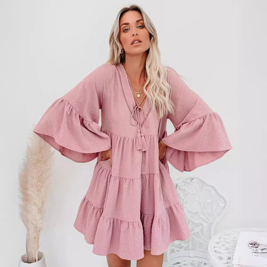 V-neck Lace-up Fringe Lace-up Ruffled Dress